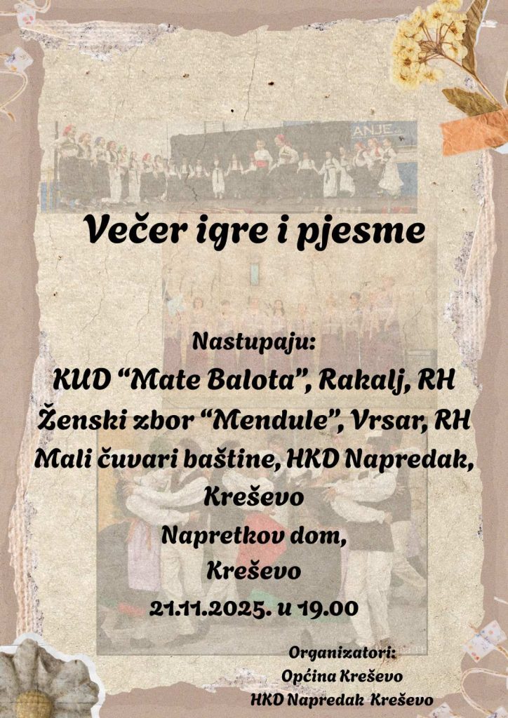 U sklopu manifestacije „Kreševo u bojama jeseni“, pozivamo vas na Večer igre i pjesme, koja će se održati u petak, 21. studenoga 2025. godine u Napretkovom domu, s početkom u 19 sati.